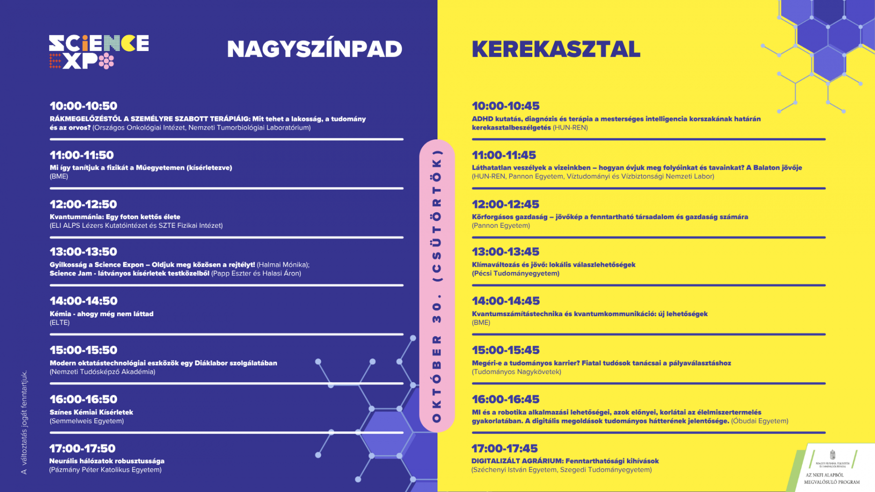Az esemény programjában interaktív bemutatók, kísérletek, robotikai és technológiai újdonságok, valamint inspiráló előadások és beszélgetések kapnak helyet. A látogatók első kézből találkozhatnak fiatal kutatókkal, akik pályájukról, felfedezéseikről és arról mesélnek, hogyan válhat a tudomány valódi életpályává.